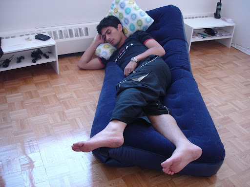 O Bruno resolveu dar uma improvisada no colchão furado para dar uma cochilada agora. Até que, depois de dobrado no meio, deu para dar uma enchidinha.